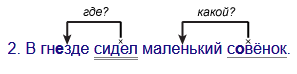 3. Что говорится о подлежащем? Совёнок сидел. Слово сидел отвечает на вопрос что делал? Значит, слово сидел - сказуемое. Подчёркиваю его двумя чертами.