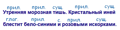 Утренняя (какая?) - прилагательное, морозная (какая?) - прилагательное, тишь (что?) - существительное, кристальный (какой?) - прилагательное, иней (что?) - существительное, блестит (что делает?) - глагол, бело-синими (какими?) - прилагательное, розовыми (какими?) - прилагательное, искорками (чем?) - существительное.